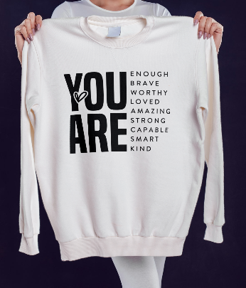 Celebrate self-love with our "You Are Enough" sweatshirt. Made with affirming words, this sweatshirt will remind you that you are worthy and capable. Cozy, comfortable, and empowering, this sweatshirt is perfect for spreading positivity and confidence. Wear it as a reminder to always believe in yourself!